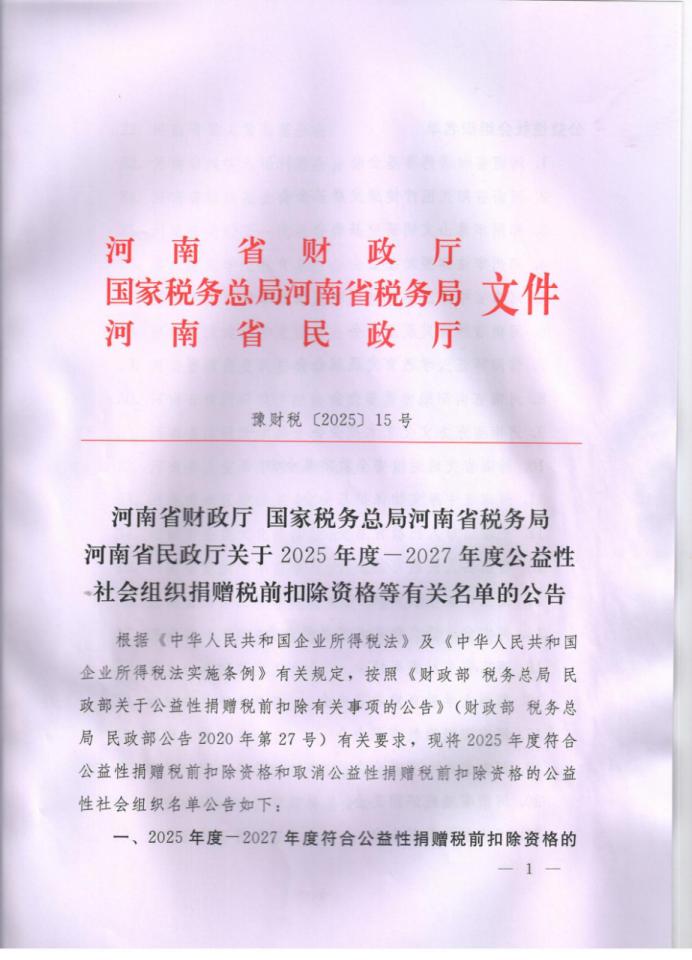关于河南省黄河科技学院教育发展基金会获得2025年度-2027年度公益性社会组织捐赠税前扣除资格有关事项的公告文件原文如下: