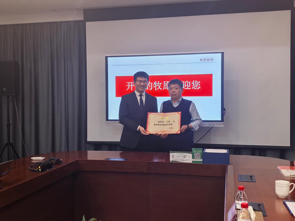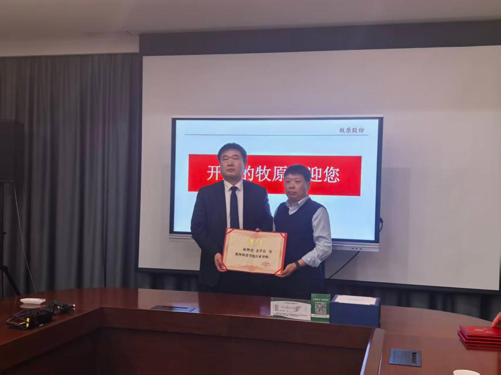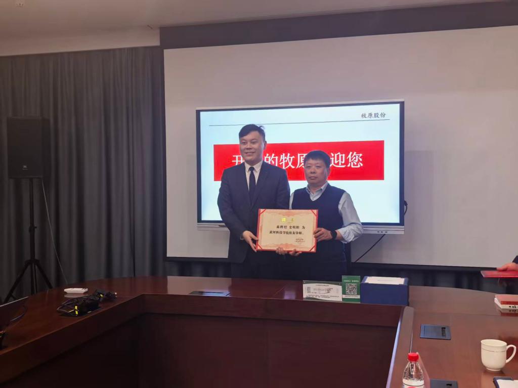 在全场嘉宾的共同见证下,座谈会举行了隆重的授牌仪式。张丕万代表黄河科技学院向牧原集团授予“毕业生优质就业基地”牌匾,感谢牧原集团长期以来对学校人才培养与就业工作的大力支持;苏学良代表牧原集团向学校授予“企业卓越人才联合培养基地”牌匾,标志着双方校企合作迈入深度融合的新阶段。随后,张丕万代表学校为苏学良颁授了行业导师聘书,为史明阳、王凯等优秀校友颁授了校友导师聘书,诚恳邀请他们深度参与学校人才共育,助力学生综合素质全面发展和职业能力全面提升。
