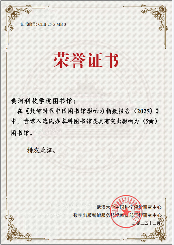 近日,在武汉大学中国科学评价研究中心(RCCSE)最新发布的《数智时代中国图书馆影响力指数报告(2025)》中,我校图书馆以卓越表现,获评最高等级的“民办本科院校图书馆-突出影响力(5★)图书馆”,在全国民办本科高校中综合得分第三,河南省民办高校位列第一。