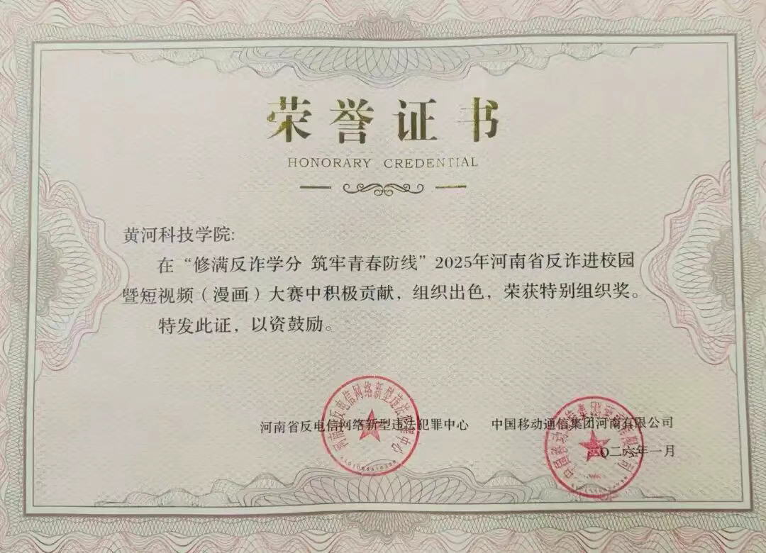 黄河科技学院在此次大赛中表现优异,荣获多项表彰:学校凭借扎实的组织工作和广泛的师生动员,获评大赛“特别组织奖”(全省仅2个获奖单位,我校为唯一高校);由我校师生创作的作品分别荣获“视频类三等奖”及“优秀作品奖”;此外,我校三位保卫干部因在反诈宣传工作中的突出贡献,被授予“反诈先进个人”荣誉称号(全省共10人获奖)。