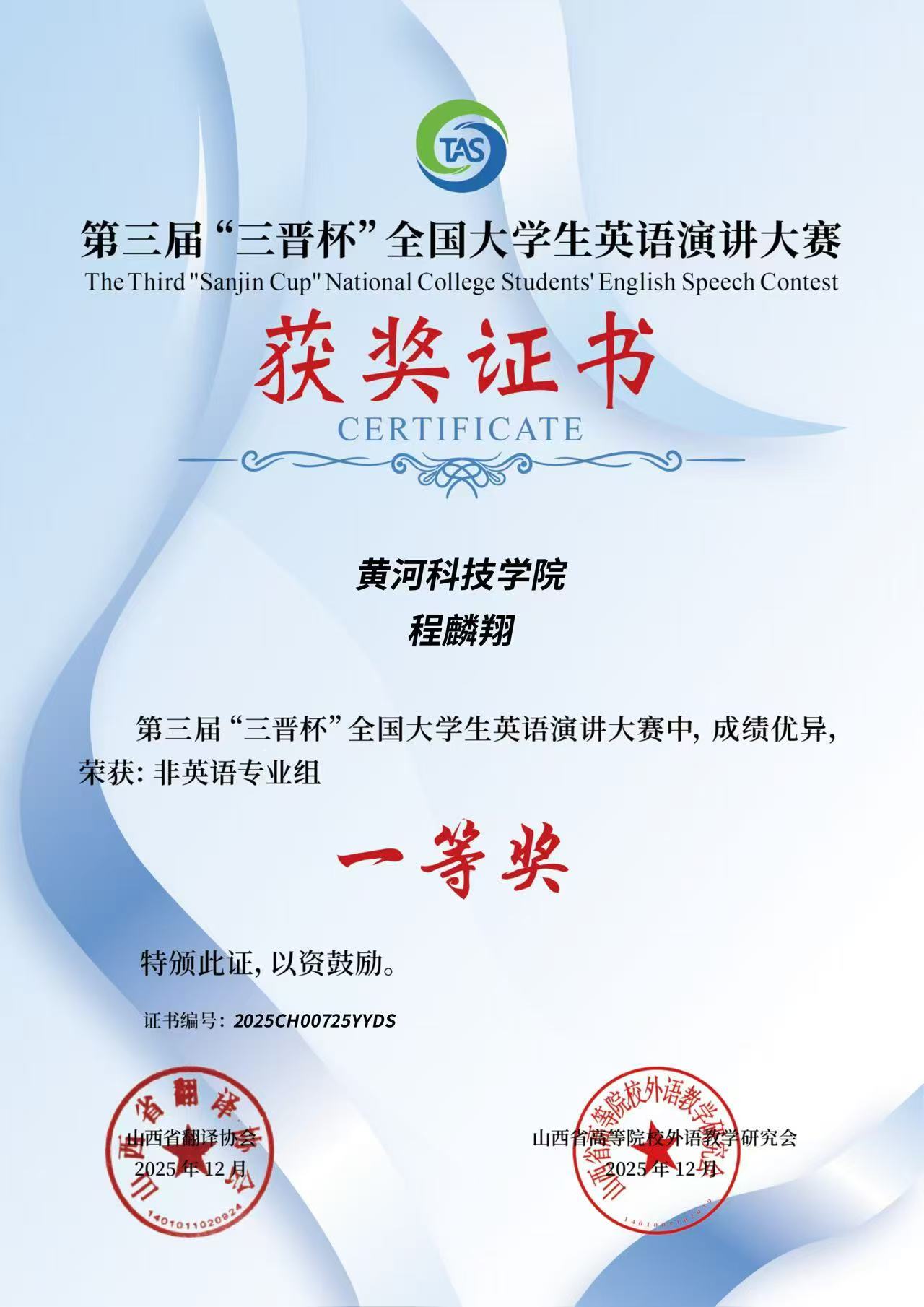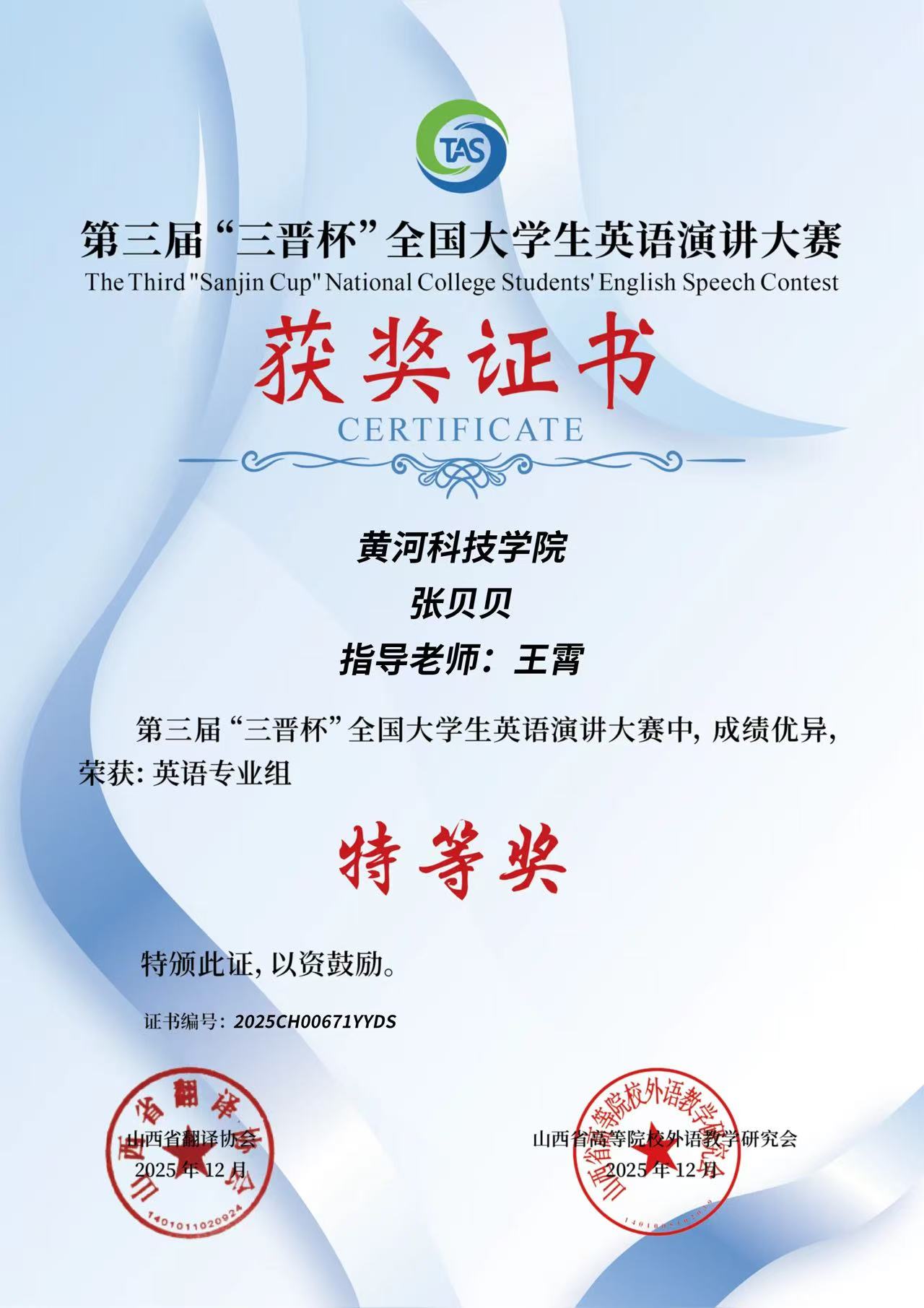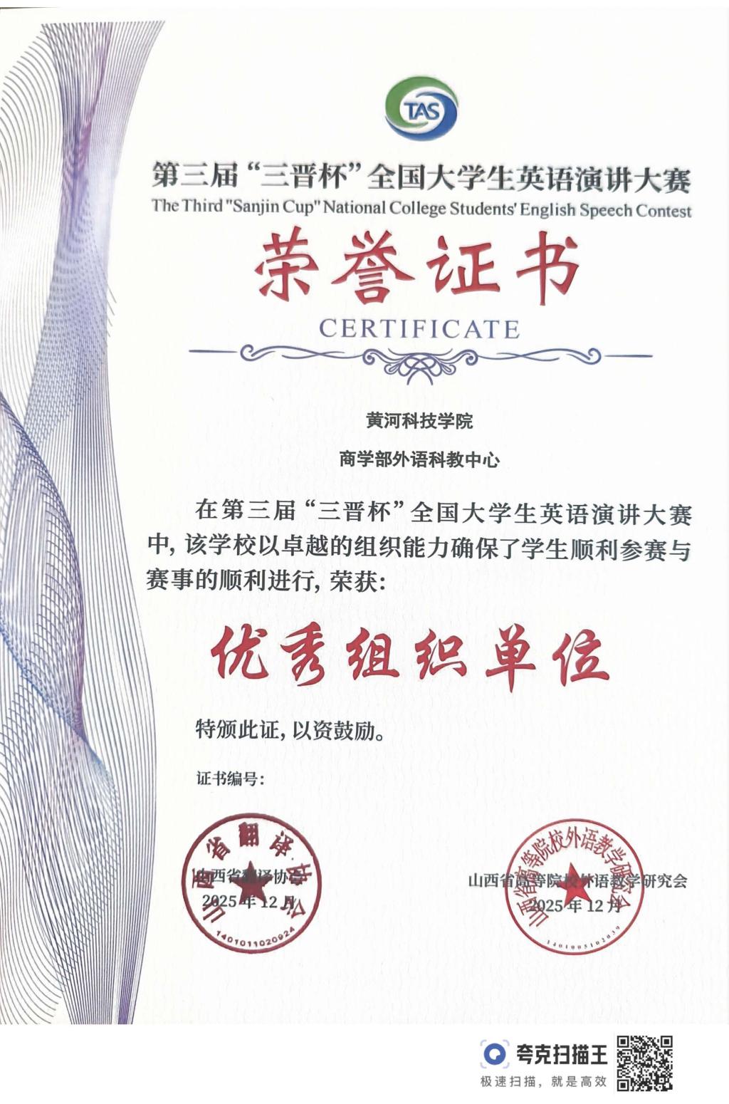 近日,由山西省人民政府外事办公室指导,山西省翻译协会、山西省高等院校外语教学研究会联合主办的第三届“三晋杯”全国大学生英语演讲大赛圆满结束。在决赛“精神薪传——让信仰在演讲中闪耀”主题竞赛中,我校商学部外语科教中心荣获优秀组织单位,学子张贝贝荣获特等奖,程祥麟、黄依凡荣获一等奖。