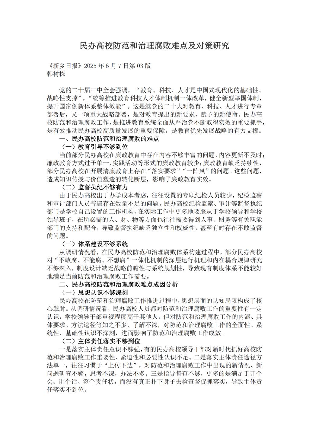 廉政专题研究 | 韩树栋 《民办高校防范和治理腐败难点及对策研究》