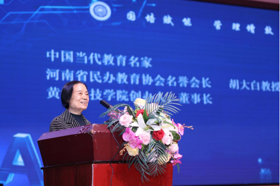 胡大白名誉会长做指导讲话。她深情回顾了自己创办黄河科技学院的传奇经历,她用学校41年来从小到大、从弱到强的发展成就表明,干事业既要抓准机遇,又要志存高远。特别是在当前知识爆炸式增长的新时代,必须重视教师继续教育和终身学习,要深刻地认识到教师需要成长,各级管理人员需要成长,董事长和校长更需要成长。希望教师成长学院的成立,能为各级各类人才的成长提供一个成本低、质量高、服务好的交流平台,也希望大家坚守初心,牢记使命,以生为本,积极探索新时代教育教学方法,不断提升教书育人本领为养德智体美劳全面发展的社会主义建设者和接班人作出新的更大贡献。