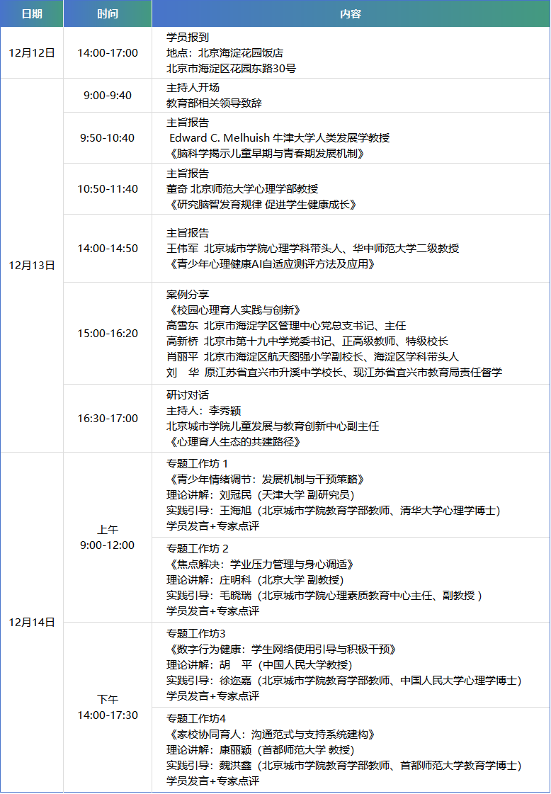 本次培训邀请牛津大学人类发展学教授、英国皇家勋章获得者(OBE)、英国社会科学院院士、北京城市学院客座教授Edward C. Melhuish;北京师范大学心理学部教授、博士生导师,认知神经科学与学习国家重点实验室学术委员会主任,国家杰出青年基金获得者,北京师范大学原校长董奇等权威专家进行主旨报告与专题分享。此外,来自北京大学、清华大学、中国人民大学、首都师范大学等知名高校的资深专家将全程主持专题工作坊,带领学员进行深度研讨与实践演练。授课专家阵容结合实际工作安排可能存在微调,最终将按“同层次、同水平”原则保障培训班质量,核心专家阵容详见附件。